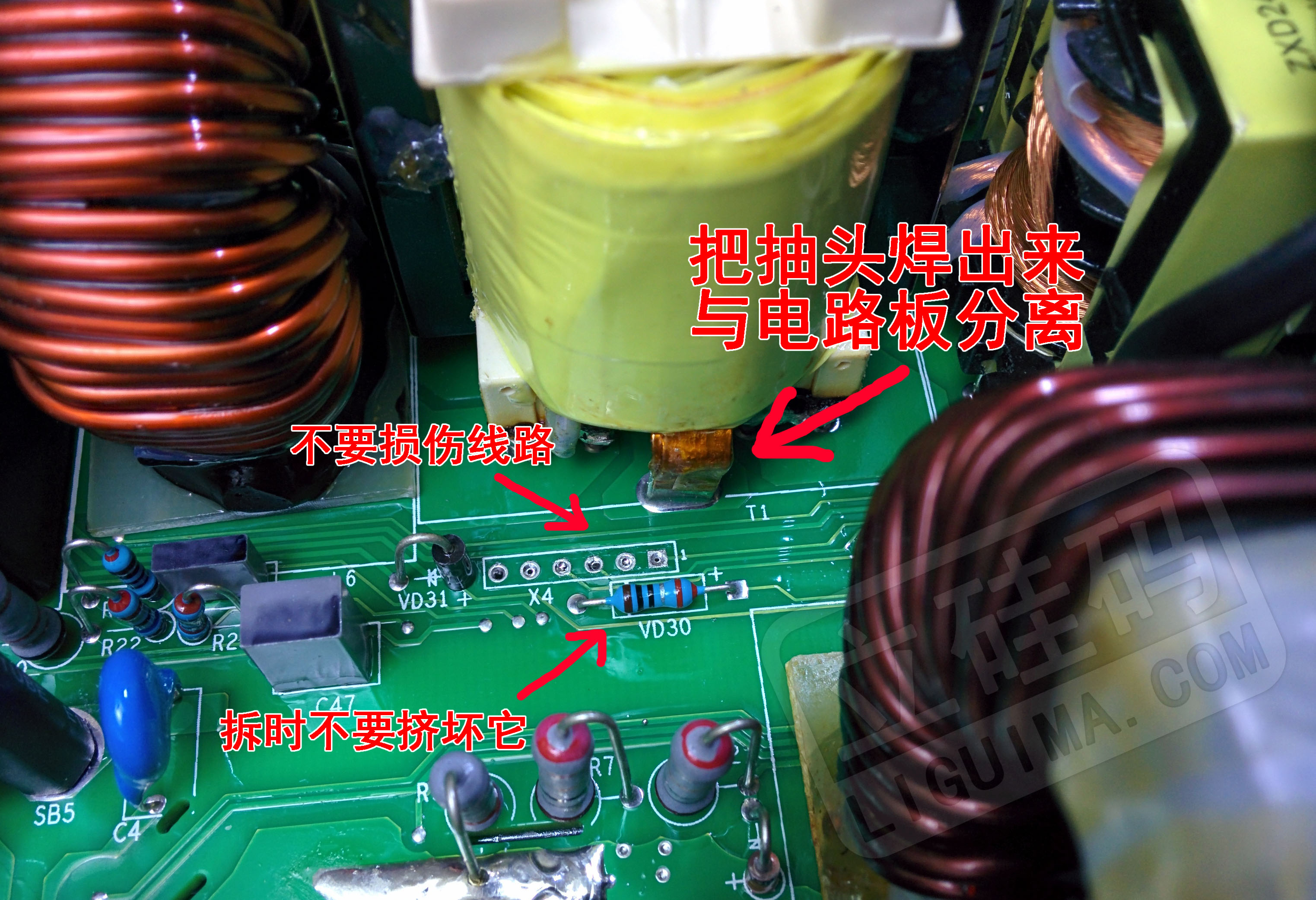 拆抽头只准使用烙铁拆焊法,禁止使用切割法、剪断法,以免破坏抽头的导电性能,埋下炸机隐患