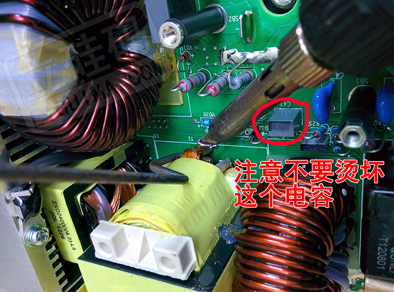 先给电容焊点多加锡,可以帮助导热,方便拆卸。