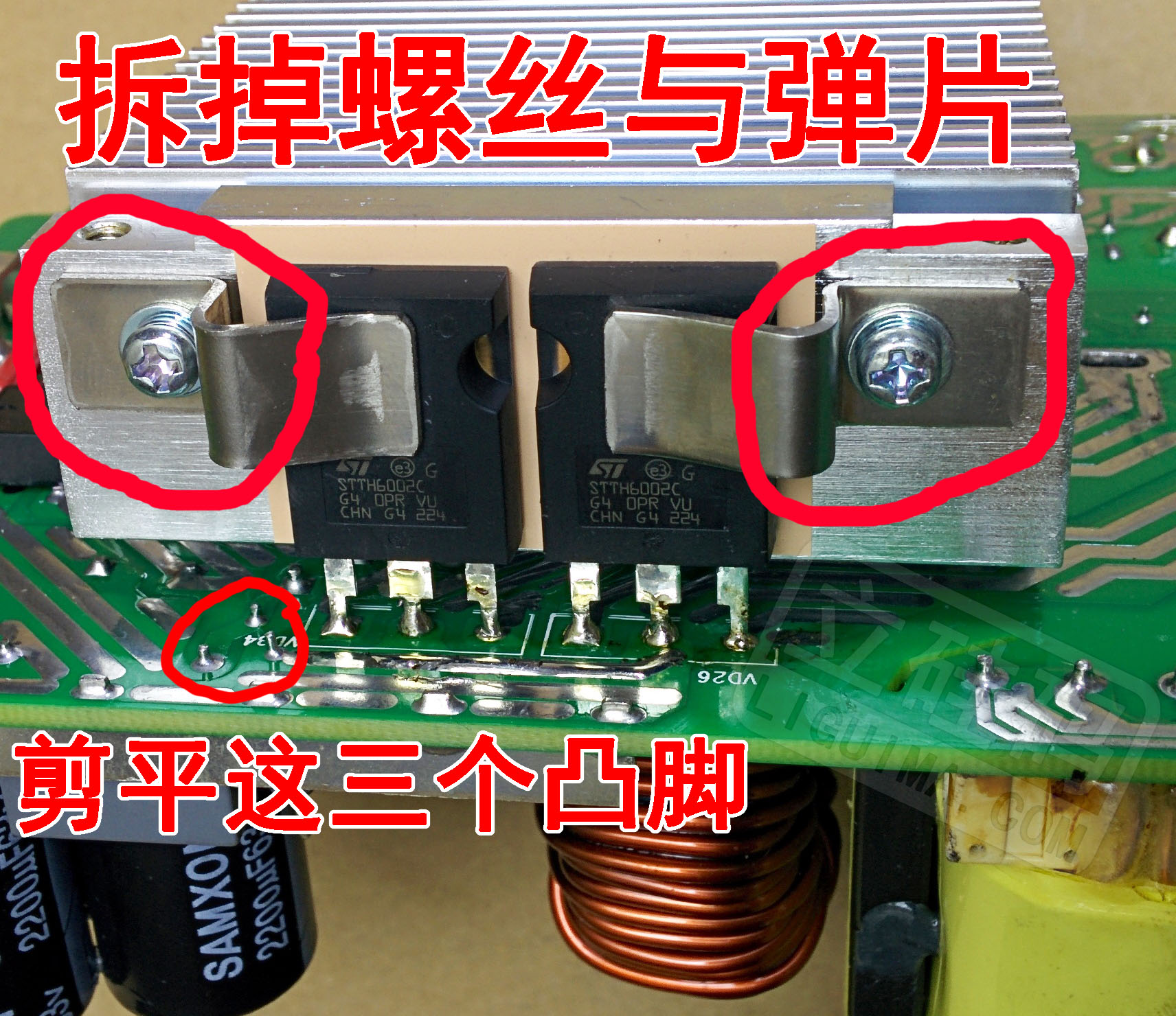 只要烙铁头形状合适(比如T12-K刀头),可以直接伸进散热器底下焊电容,无需拆除散热器。