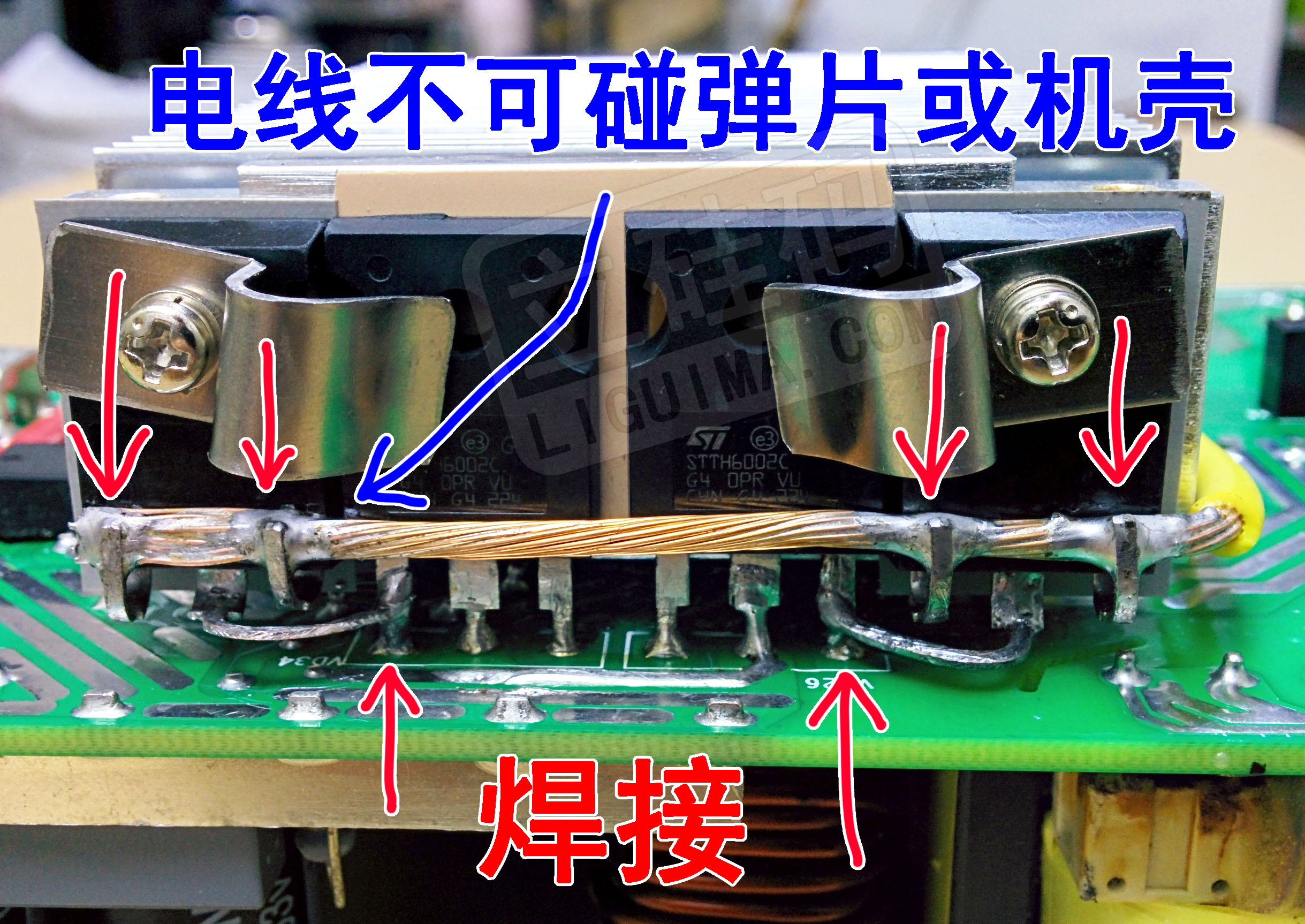 焊接的电线推荐用2平方左右的,最少也要1平方,不要碰到弹片或机壳,一整根线从头到尾一路焊接,不可分叉。